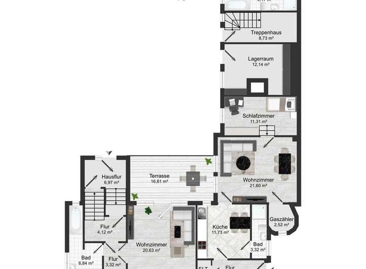 6 Wohnungen befinden sich im Objekt. 4 im Haupthaus, eine im Seitengebäude und eine im Hinterhaus/Gartenhaus, das über einen eigenen Mietergarten verfügt.