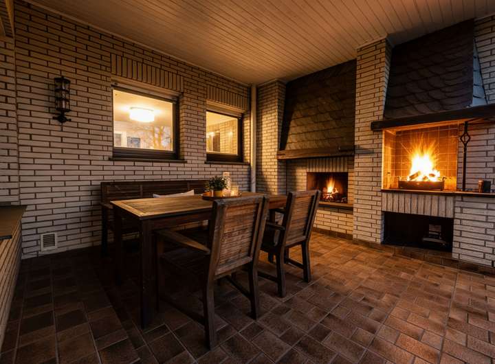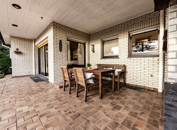 Ein offener, lichtdurchflutete Wohnbereich bietet viel Platz für Ihre individuellen Einrichtungswünsche. Der Kamin im Wohnzimmer sorgt für behagliche Wärme und eine gemütliche Atmosphäre. Der direkte Ausgang zur Terrasse und in den Garten schafft eine angenehme Verbindung zwischen Innen- und Außenbereich.