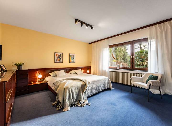 - Schlafzimmer & Badezimmer: Ein in sich abgeschlossener Privatbereich umfasst ein großzügiges Schlafzimmer, einen separaten Ankleidebereich sowie ein komfortables Bad (Wanne und Dusche). Eine zusätzliche Tür trennt diesen Bereich vom Hauptflur, sodass ein äußerst geschütztes und ungestörtes Wohngefühl entsteht.
