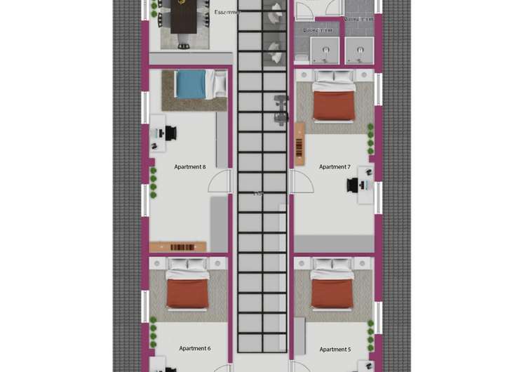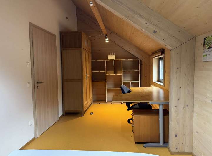 Das Dachgeschoss beherbergt vier eigenständige 1-Zimmer-Apartments, die einen idealen Rückzugsort bieten und dennoch in ein funktionales Gemeinschaftskonzept eingebettet sind. Eine gemeinsame Küche sowie ein gemeinschaftlich genutztes Bad und Toiletten stehen allen Bewohnern zur Verfügung.