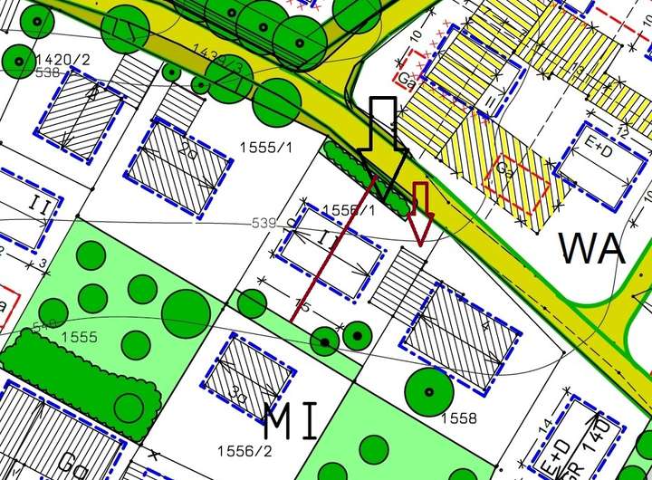 Wegen dem Baufenster darf man auf die linke Hälfte des Grundstücks eine DHH 7,50 bis 7,80 x 10,00 Meter, je nach Gebäudehöhe.