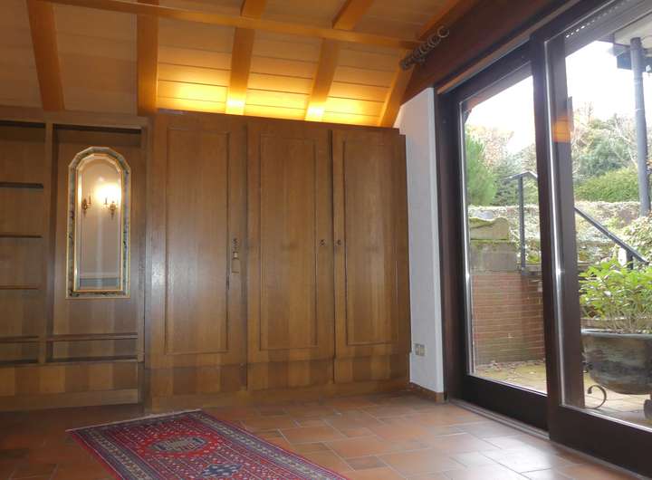 Beim Betreten des Hauses gelangen Sie zunächst in einen Windfang mit Garderobenbereich. Von hier aus öffnet sich die Wohndiele mit direktem Zugang zum Garten sowie zum Gäste-WC. Eine Treppe führt Sie weiter in den Hauptwohnbereich. Hier erwarten Sie eine schöne Küche mit Ausgang zur großen Terrasse, eine Abstellkammer, ein Gästezimmer, ein großzügiges Esszimmer und ein Wohnzimmer. Vom letzteren haben Sie Zugang zur überdachten Terrasse mit Außenkamin und in den gepflegten Garten.