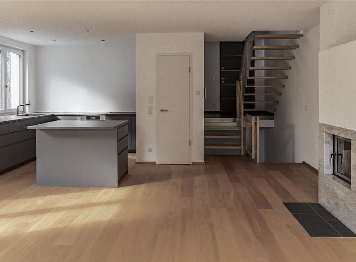 Im Erdgeschoss liegt der großzügige Wohn- und Essbereich mit offener Küche, Kamin und großen Fensterflächen. Der Boden aus Eichenholz verleiht dem Raum eine warme, hochwertige Atmosphäre. Die Küche ist modern ausgestattet und fügt sich optisch schön in den Wohnraum ein. Außerdem gibt es auf dieser Ebene ein Gäste-Duschbad sowie eine Speisekammer.