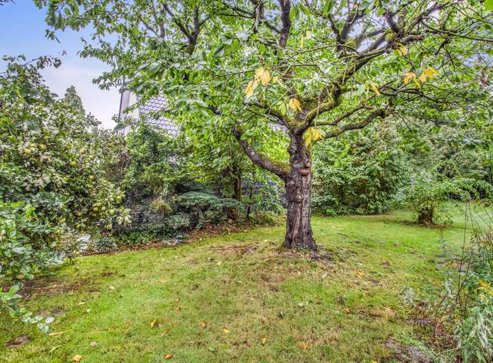 Im Erdgeschoss erwarten Sie vier Zimmer, darunter ein helles Wohnzimmer mit direktem Zugang in den Garten, ein Schlafzimmer, zwei kleinere Zimmer, ein Badezimmer sowie ein Gäste-WC. Die Küche ist mit einer älteren Einbauküche ausgestattet und bietet Platz für einen Essbereich.