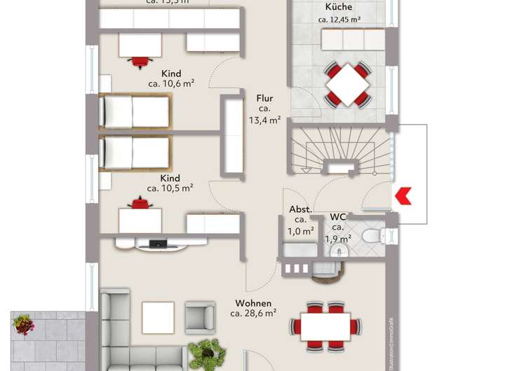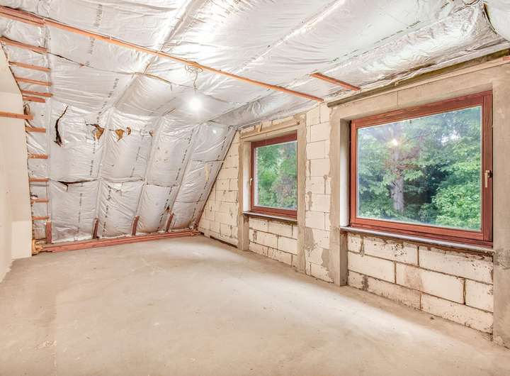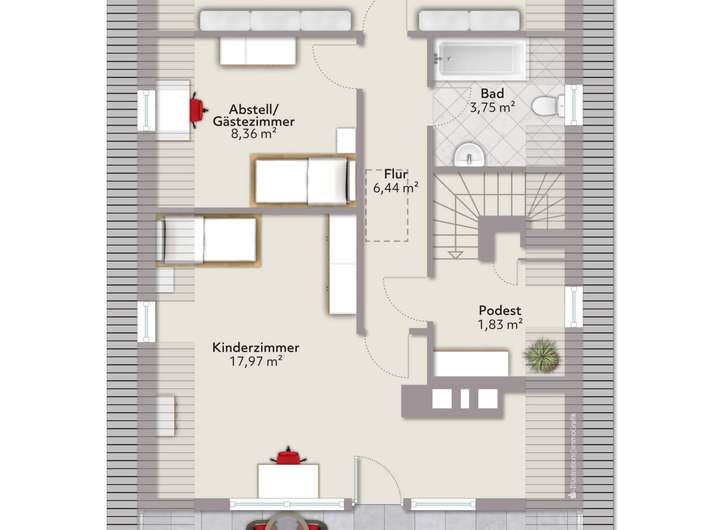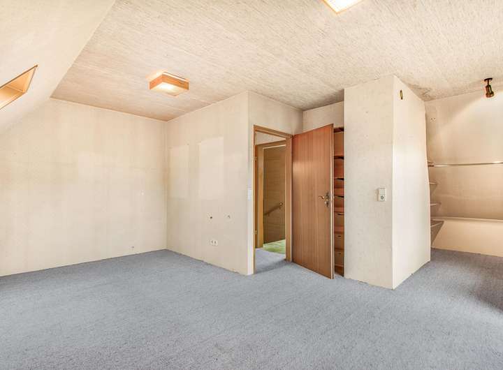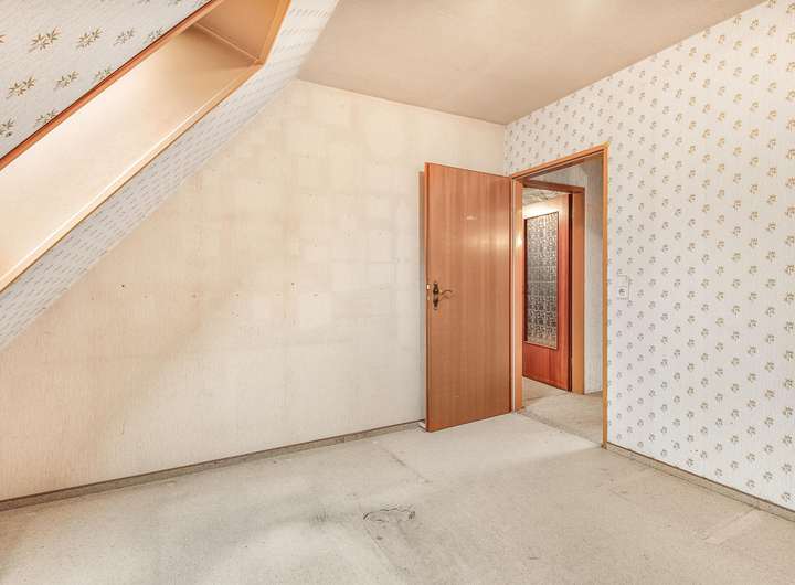 Das Obergeschoss verfügt über zwei weitere Zimmer, eines davon mit Zugang zur Loggia. Ein zusätzlich vorhandener Raum bietet Ausbaupotenzial. Darüber hinaus steht ein Spitzboden zur Verfügung.