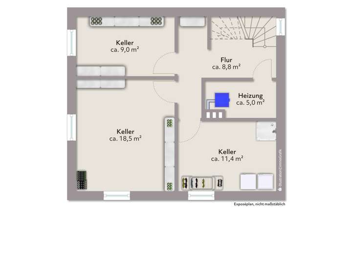 Das Haus ist teilunterkellert. Neben drei Kellerräumen befindet sich hier auch der Heizungsraum. Die Ölheizung liegt unter der Einfahrt, außerhalb des Hauses. Die Haustechnik ist solide und voraussichtlich noch lange zuverlässig. Eine Prüfung und Offenlegung ist möglich.