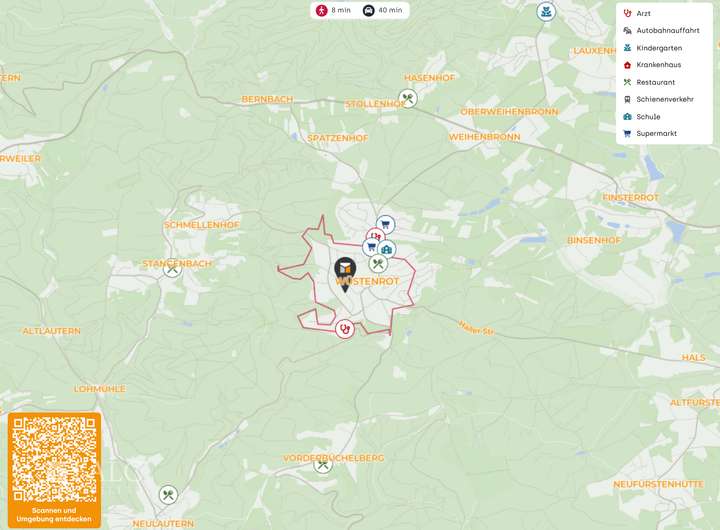 Die Versorgungseinrichtungen des täglichen Bedarfs – darunter Supermärkte, Bäckerei, Apotheke und Gastronomie – befinden sich im Ortszentrum von Wüstenrot, das in wenigen Minuten erreichbar ist. Kindergärten, Schulen sowie öffentliche Einrichtungen sind ebenfalls gut angebunden.