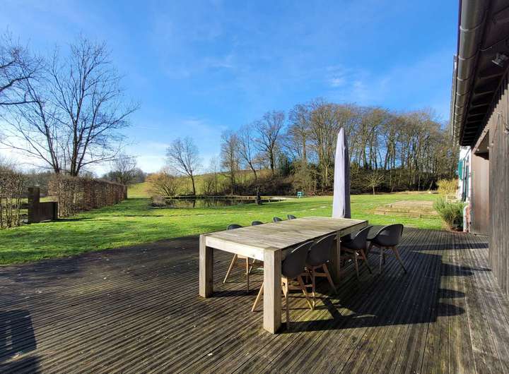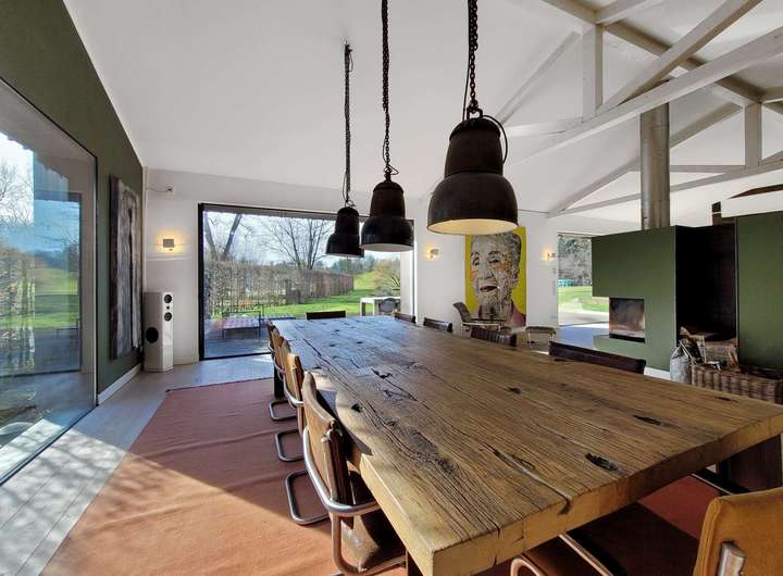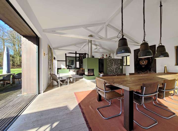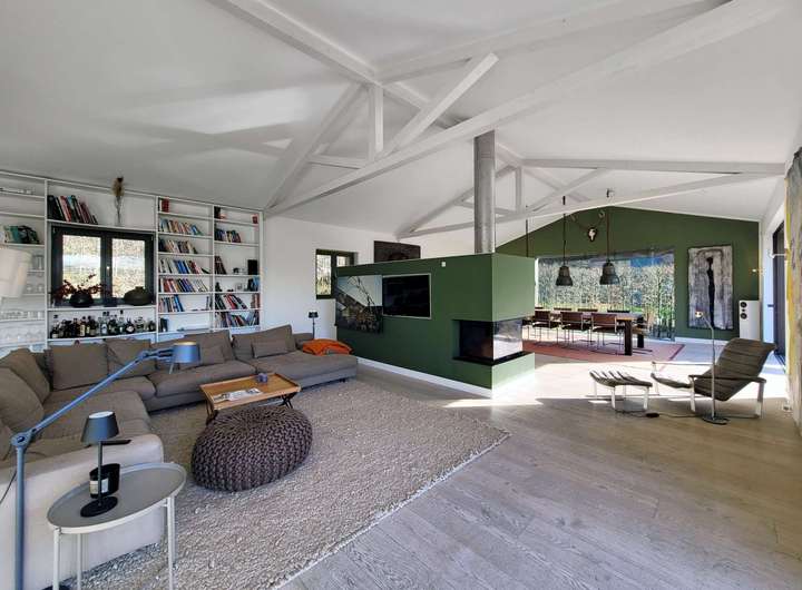 Der Wohn- und Essbereich im Anbau beeindruckt mit Panorama-Schiebefenstern, die den Blick auf das weitläufige Grundstück mit mehreren kleinen Seen freigeben und Zugang zur großen Terrasse bieten. Ein massiver Kamin trennt stilvoll Wohn- und Essbereich.