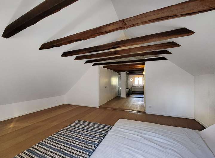 Im Obergeschoss befinden sich vier flexibel nutzbare Räume als Schlaf-, Kinder-, Gäste- oder Arbeitszimmer sowie ein modernes Duschbad. Das Dachgeschoss beherbergt die großzügige Mastersuite mit Schlafzimmer, Ankleide und luxuriösem Bad. Sichtbare Dachbalken verleihen den Räumen eine einladende Atmosphäre.