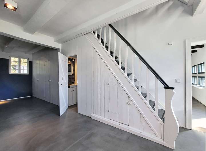 Im Entree finden Sie eine historische Holztreppe, die geschickt Garderobe und Gäste-WC integriert. Die großzügige Wohnküche strahlt eine einladende Atmosphäre zum Kochen und Beisammensein aus und besticht durch Ihre offenliegende Holzbalken in Kombination mit hochwertigen Materialien und modernen Geräten.