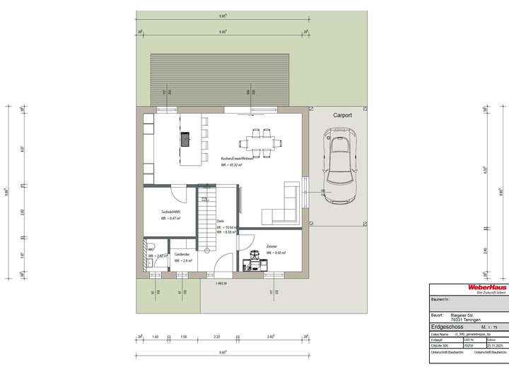Die Immobilie überzeugt mit einem klar strukturierten Grundriss: Im Erdgeschoss befindet sich ein großzügiger Wohn- und Essbereich mit offener Küche und direktem Zugang zum privaten Garten, der bewusst abgewandt von der Straße liegt und viel Privatsphäre bietet. Ergänzt wird das Erdgeschoss durch ein Gäste-WC und einen Hauswirtschaftsraum. Im Obergeschoss befinden sich flexibel planbare Schlafbereiche für Eltern und Kinder sowie ein modernes Familienbad – die Grundrissgestaltung kann nach Käuferwunsch individuell angepasst werden, um persönlichen Wohnbedürfnissen gerecht zu werden. Die Ausstattung entspricht dem hochwertigen WeberHaus-Standard und umfasst unter anderem eine Luft-Wärmepumpe, Fußbodenheizung, große Fensterflächen, energieeffiziente Bauweise, wohngesunde Materialien sowie eine moderne Sanitärausstattung. Im Kaufpreis enthalten sind zudem eine hochwertige Einbauküche, ein Carport sowie sämtliche Kaufnebenkosten.