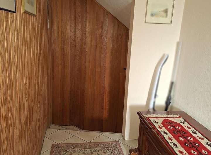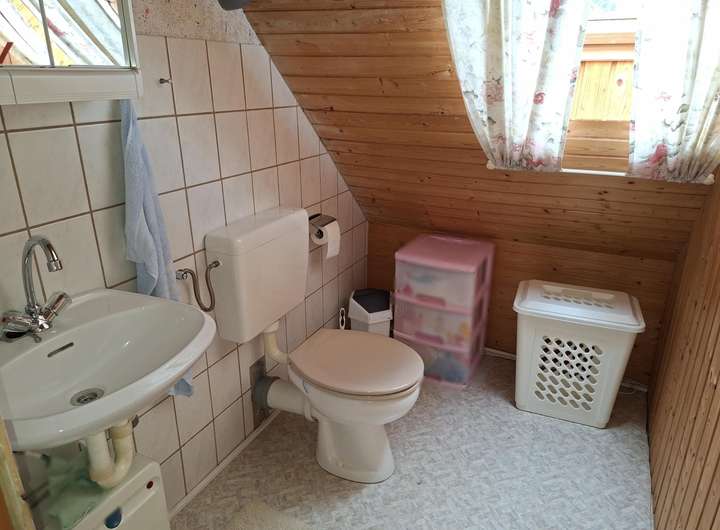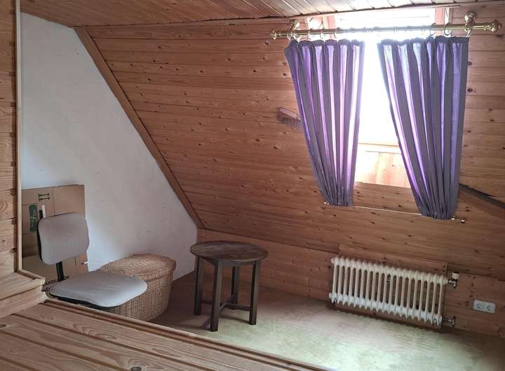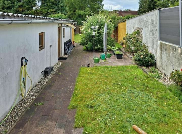 Über eine breite Auffahrt gelangen Sie zum seitlich gelegenen Eingangsbereich. Die Wohnfläche im Erdgeschoss teilt sich auf in ein großes Wohnzimmer, Küche mit Esszimmerbereich und Gäste- WC. Im Dachgeschoss (Obergeschoss) ist ein großes Schlafzimmer, zwei weitere Zimmer und das Badezimmer. Der Dachboden wurde für private Zwecke ausgebaut. Ein größerer Raum, ein kleiner Raum und ein WC bieten dort einen möglichen Gästebereich oder Platz für ein Kind. Die Garage mit Grube ist groß genug für einen PKW/ SUV, dahinter befindet sich ein Werkstattbereich und ein Geräteschuppen mit Brunnenanlage. Die Grube ist aus Sicherheitsgründen mit Bohlen abgedeckt. Auf der Auffahrt können 3-5 kleine PKW`s parken. Von der Zufahrt gelangt man durch eine abschließbare Tür in den hinteren Gartenbereich. Der Garten ist pflegeleicht angelegt mit Ziergehölz und Rasenflächen. Eine Sonnenterrasse lädt zum Verweilen ein.