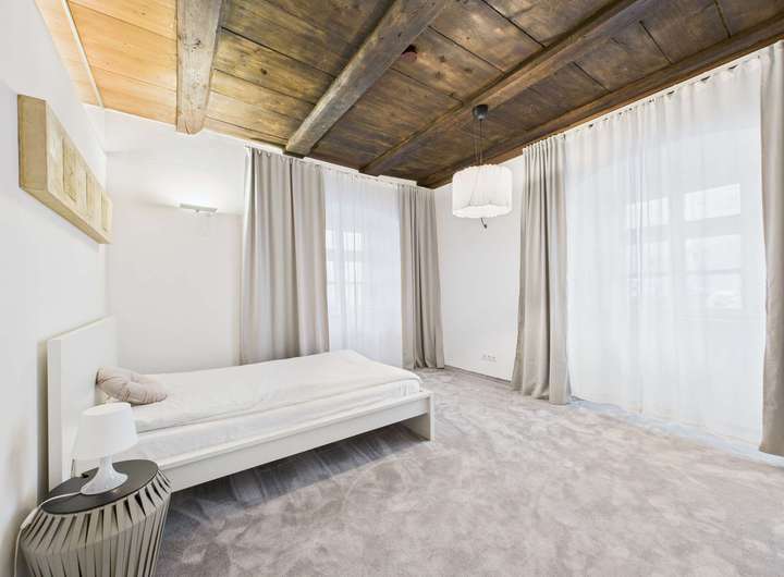 Das Master-Bedroom überzeugt mit einem luxuriösen Bad-en-Suite inklusive freistehender Designer-Badewanne, Rain-Shower-Dusche mit Massagefunktion und traumhaftem Donau-Blick. Die Fassade des Hauses besteht zu großen Teilen aus der alten Stadtmauer. Das wird insbesondere in einem dahinterliegenden weiteren Schlafzimmer deutlich, da hier das alte Gemäuer sichtbar gemacht wurde. In dieses Schlafzimmer ist eine Ankleide integriert.