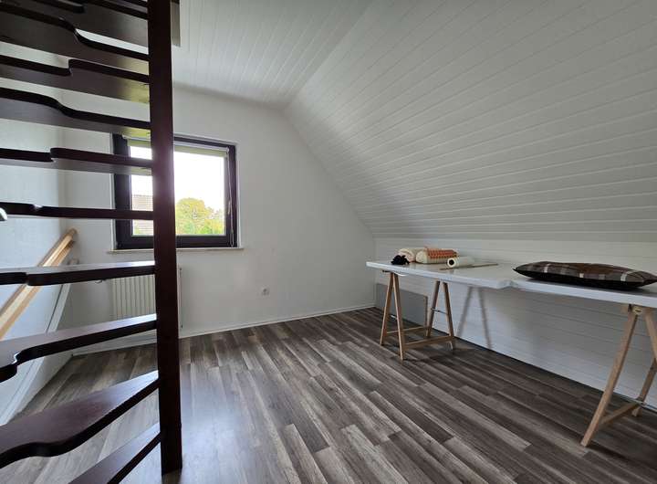 Das Erdgeschoss setzt sich aus einem großzügigen Wohnzimmer mit Kamin, der Küche und einem Tageslichtbad mit Dusche zusammen. Das Dachgeschoss besteht aus drei Zimmern und einem Tageslichtbad mit Badewanne. Von einem der Zimmer führt eine Raumspartreppe direkt in den Spitzboden des Hauses, welcher zwischenzeitlich ausgebaut wurde.