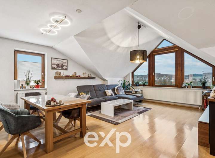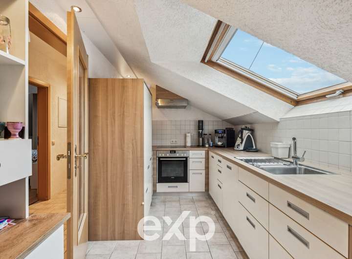 Über einen hellen Aufgang erreichen Sie den modernen Anbau. Hier begeistert eine Galerie, die sich als sonniges Büro mit fantastischem Weitblick nutzen lässt. Auch der Wohn- und Essbereich im Obergeschoss ist ein Ort zum Wohlfühlen: Ausgestattet mit einem Kaminofen und großen Fensterfronten, genießen Sie hier viel Licht und Wärme. Die Küche ist modern mit Markengeräten eingerichtet, und das Badezimmer profitiert dank Oberlicht von natürlicher Helligkeit.