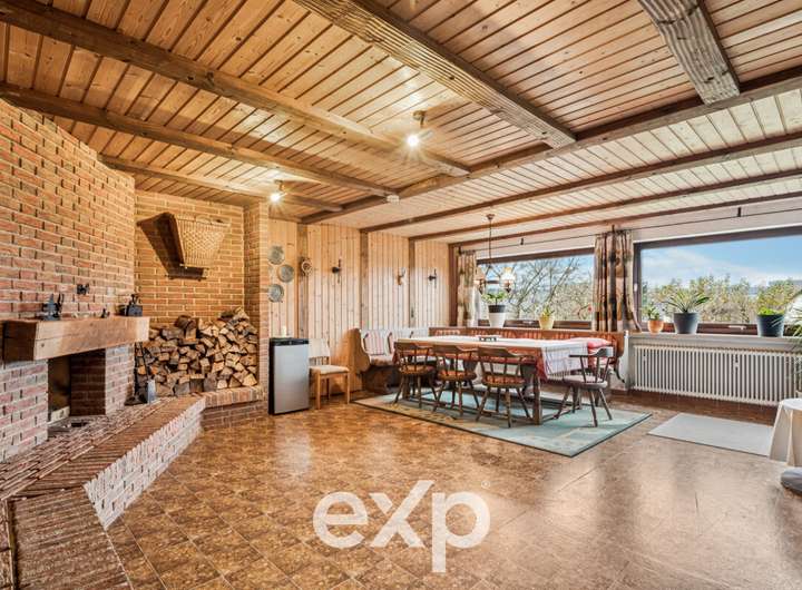 - Exklusives Raumgefühl: Riesiges Esszimmer mit offenem Kamin und Fensterfront sowie zusätzlicher Kaminofen und Galerie im OG.