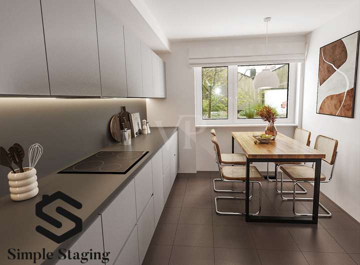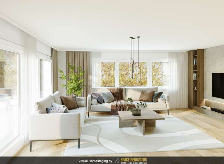Ein zentrales Merkmal der Immobilie ist das großzügige Wohnzimmer mit Kachelofen, das genügend Platz für eine gemütliche Sitzecke und einen Essbereich bietet. Die großen Fensterflächen lassen viel Tageslicht herein und schaffen eine einladende Atmosphäre. Die angrenzende Küche ist funktional und für Hobbyköche bestens geeignet. Hier besteht ausreichend Raum für eine Essecke, die den täglichen Familientreffpunkt darstellen kann.