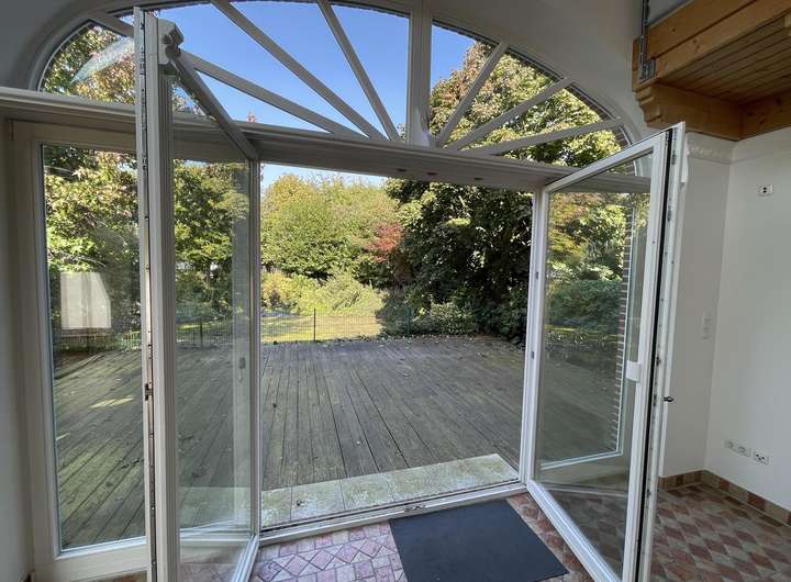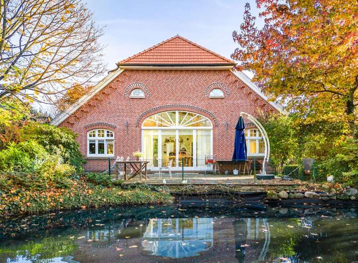 Aktuell befindet sich direkt hinter der Terrasse ein kleiner Teich und dahinter dann eine Rasenfläche. Der Garten ist jedoch sehr groß und kann nach Ihren Wünschen frei umgestaltet werden (z.B. großer Spielbereich für die Kinder oder ähnliches).