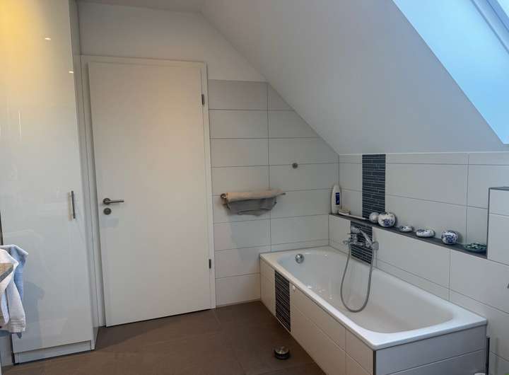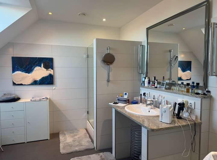 Die Immobilie verfügt über fünf Zimmer, darunter zwei geräumige Schlafzimmer, die zum Entspannen und Wohlfühlen einladen sowie ein Büro bzw. Gästezimmer. Die zwei modernen Badezimmer sind mit hochwertigen Armaturen ausgestattet und bieten ein exquisites Ambiente. Die Schlafräume und die Vollbäder liegen im Obergeschoss des Hauses. Im Erdgeschoss befinden sich der HWR, ein Gäste-WC, sowie der Essbereich und auch der Wohnbereich der Immobilie. Die voll ausgestattete Einbauküche, die sich ebenfalls im Erdgeschoss befindet, rundet das Angebot ab und lässt keine Wünsche offen. Die Einbauküche mit hochwertigen Siemensgeräten wie Dampfgarer und Backofen mit integrierter Mikrowelle ist zudem inkludiert im Kaufpreis.