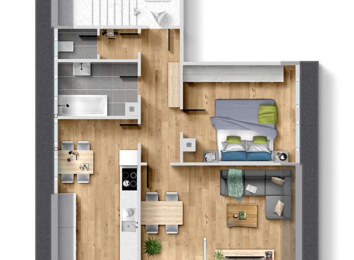 Ein weiteres Highlight ist das Tageslichtbad, das modernen Komfort bietet, sowie das zusätzliche separate WC, das für mehr Bequemlichkeit sorgt.