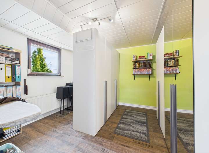 Der Anbau aus 2000 erweitert das Haus um wertvolle Nutzungsmöglichkeiten. Ob als Atelier, Büro, oder separate Einheit für Angehörige – die räumliche Struktur eröffnet viele Optionen. Die Einliegerwohnung im Untergeschoss ist vollständig ausgestattet und schafft Flexibilität für Vermietung, Gäste oder ein unabhängiges Wohnen unter einem Dach.