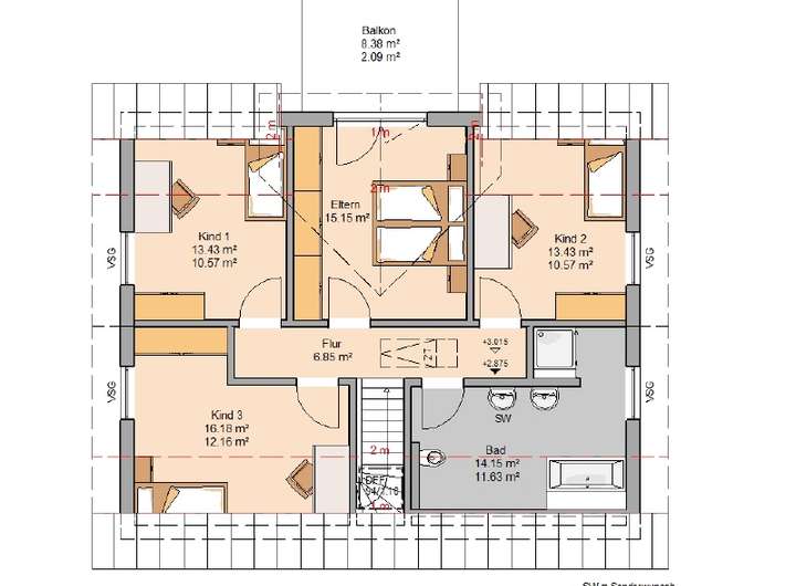 Das Dachgeschoss beherbergt drei Kinderzimmer und ein großes Elternschlafzimmer. Eine Gaube bietet große Fensterflächen für einen einmaligen Blick ins Grüne. Der Balkon bietet zusätzlichen Freiraum für die Bauherren.