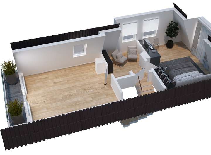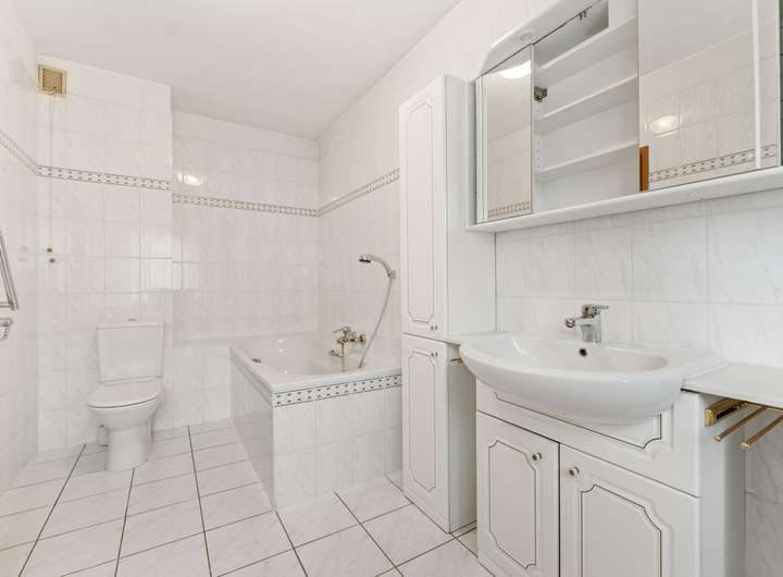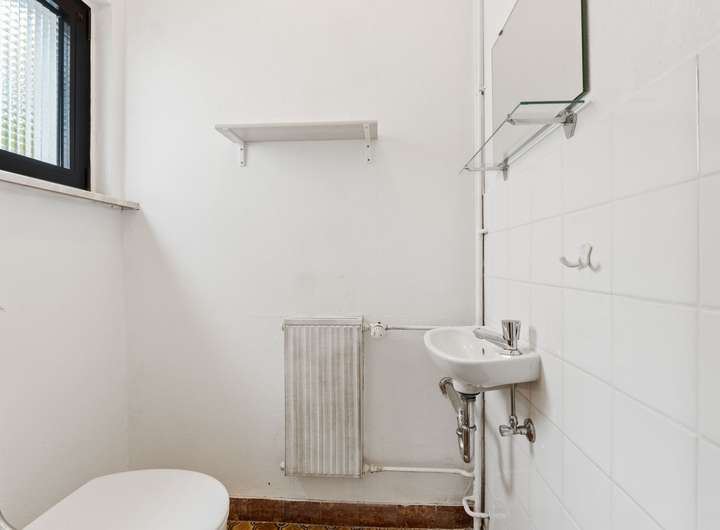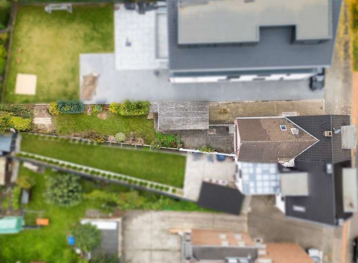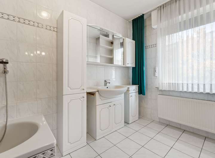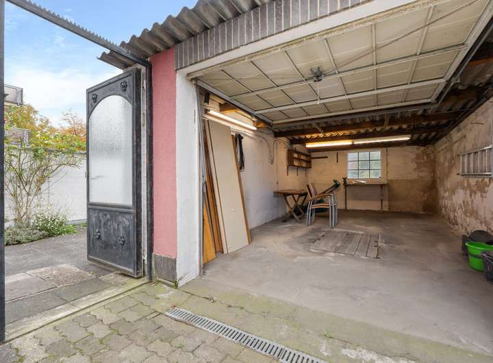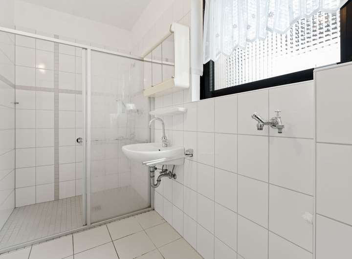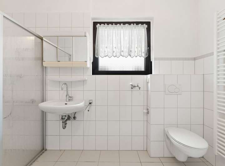 Auf der rechten Seite der Diele liegt die große Küche, die genügend Platz für eine Essecke bietet und zur Verwirklichung einer modernen Traumküche einlädt. Von der Küche aus haben Sie Zugang zu einem weiß gefliesten Badezimmer mit einer ebenerdigen Dusche, einem WC, einem Waschbecken, einem Handtuchheizkörper und einem Fenster. Ebenfalls von der Küche gelangen Sie auf die Terrasse und in den Garten des Hauses. Der Garten bietet reichlich Platz für Kinder, Grillabende mit Freunden oder für Hobbygärtner, die ihre eigenen Ideen umsetzen möchten. Eine Tür trennt den Garten von der Garage und sorgt so für zusätzliche Privatsphäre. Die Garage selbst ist großzügig geschnitten und bietet neben dem Stellplatz für ein Auto auch ausreichend Stauraum für Gartengeräte und Zubehör.
