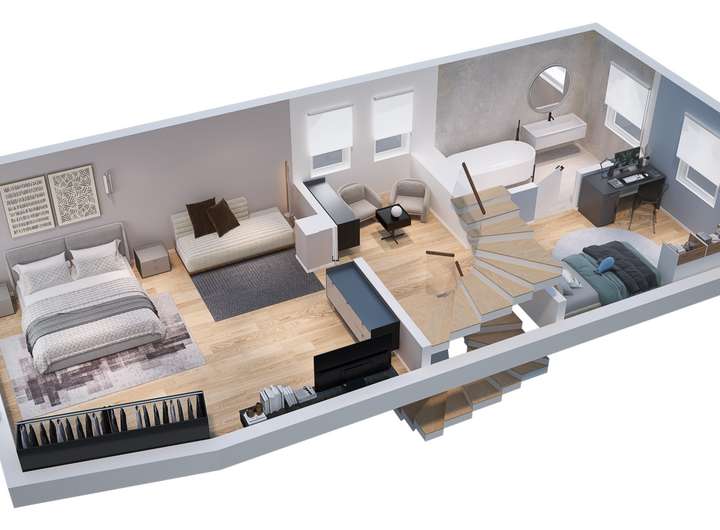 Über eine Holztreppe gelangen Sie ins Obergeschoss. Rechts befindet sich ein gemütliches Schlafzimmer mit einem angrenzenden Badezimmer, das mit einer Badewanne, einem Waschbecken, einem WC und einem Fenster ausgestattet ist. Auf der linken Seite der Diele liegt ein weiteres, besonders großes Schlafzimmer mit Blick in den Garten. Hier ist genügend Platz für ein großes Bett, einen Ankleidebereich oder wahlweise eine wohnliche Sitzecke, sodass sich dieser Raum auch wunderbar als Wohnzimmer eignet.