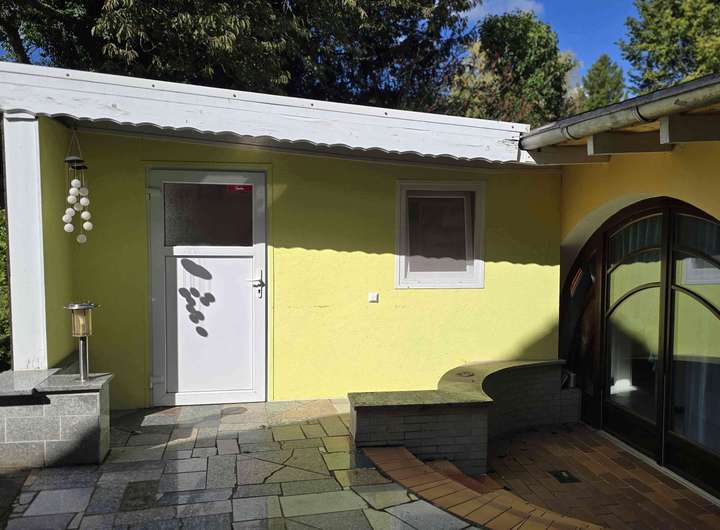 Im hinteren Anbauteil des Gebäudes befinden sich eine Garage mit Zugang zum Haus, ein weiterer Hobbyraum und ein Dampfbad.