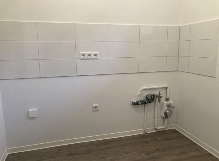 - Küche: Weißer Fliesenspiegel, dunkler Fliesenboden, keine Einbauküche