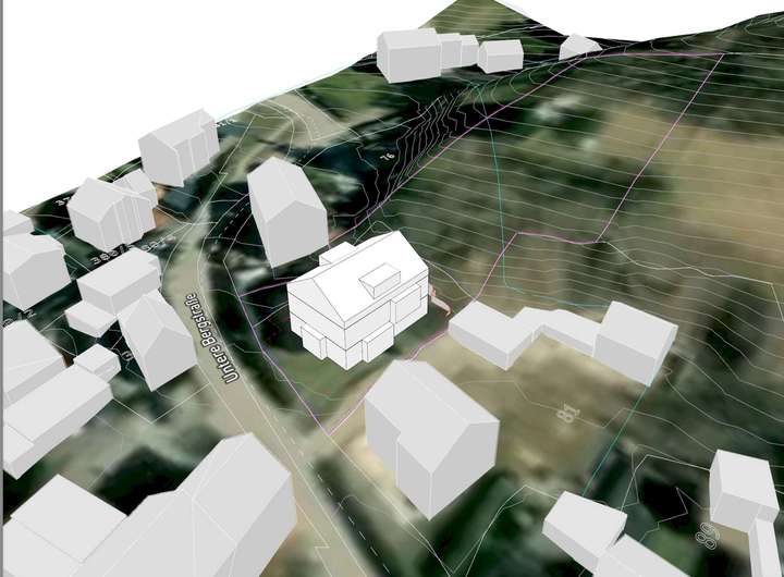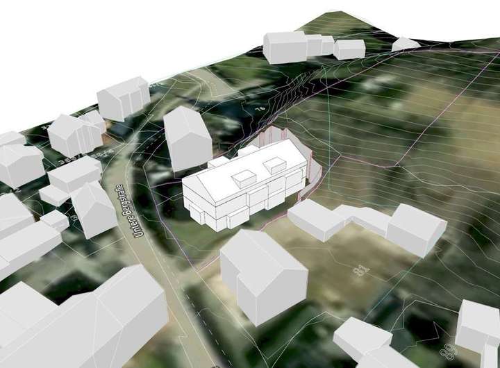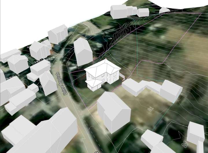 Die Hangfläche sorgt für architektonische Dynamik und attraktive Bebauungslösungen - verschiedene Machbarkeitsstudien liegen vor und Kontakt zum Bauamt besteht auch schon.