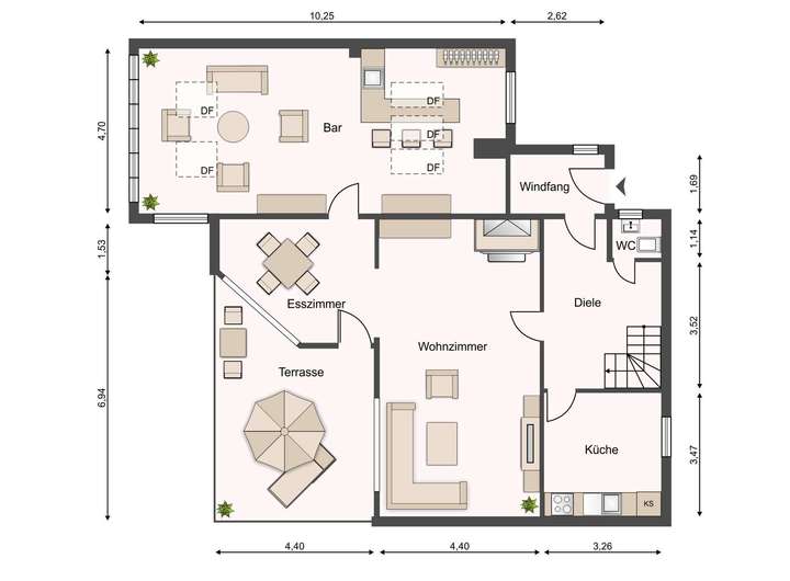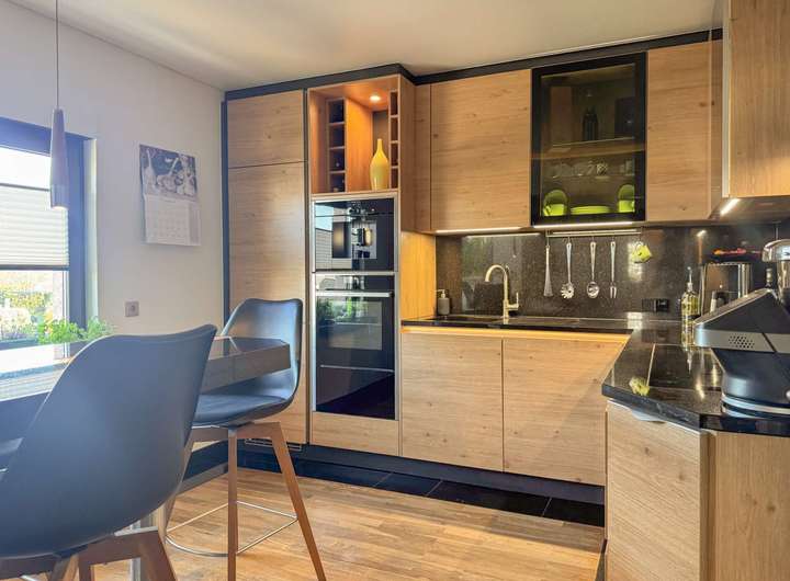 Über einen einladenden Eingangsbereich gelangt man in das stilvoll gestaltete Erdgeschoss. Hier befindet sich ein Gäste-WC sowie die großzügige Küche mit hochwertiger Einbauküche (im Kaufpreis enthalten) und integriertem Essbereich.