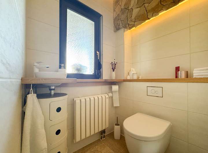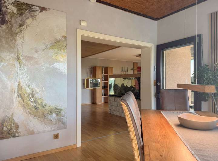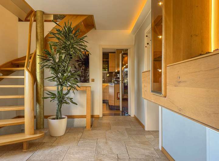 Bereits beim Betreten spürt man die besondere Atmosphäre: liebevoll gesetzte Details, indirekte Beleuchtung, besondere Materialien an Wänden und Decken und ein stimmiges Lichtkonzept schaffen ein einzigartiges Wohngefühl. Dieses Haus ist alles andere als Standard, es ein echtes Liebhaberobjekt.