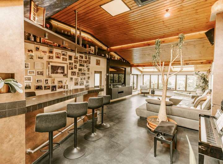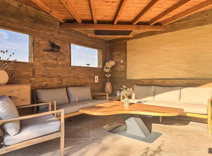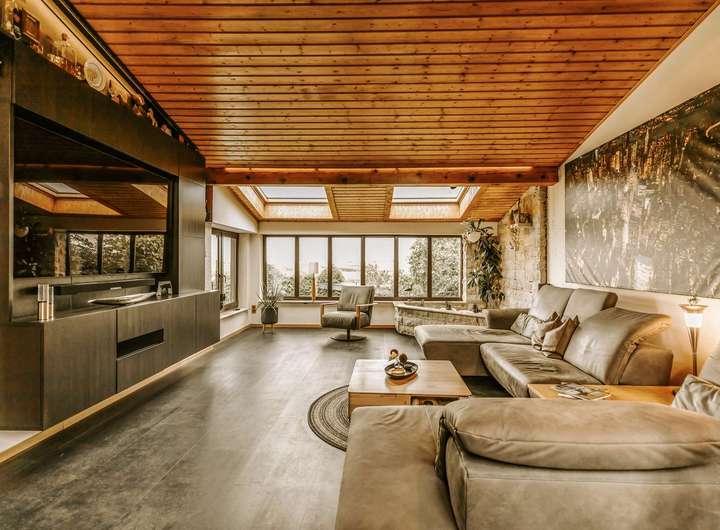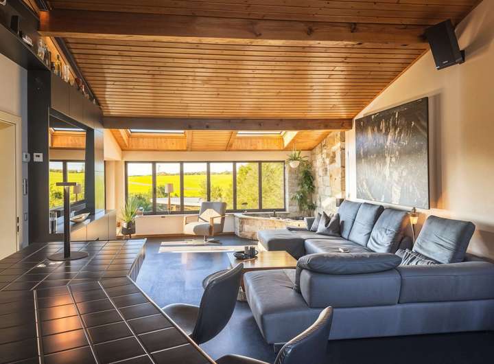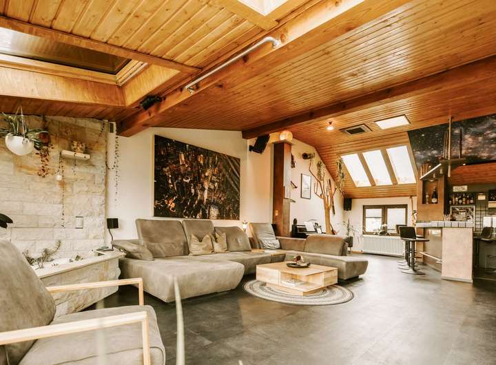 Ein absolutes Highlight ist der 2020 modernisierte Anbau mit seinen imposanten Holzdecken, einer stilvollen Bar und erneut wunderschönem Panoramablick. Dieser Bereich bietet viel Platz für einen weiteren Wohn- oder Loungebereich und begeistert durch seine hochwertige Ausstattung und die einmalige Atmosphäre, perfekt um als Familie zusammenzukommen oder zum Gäste empfangen.