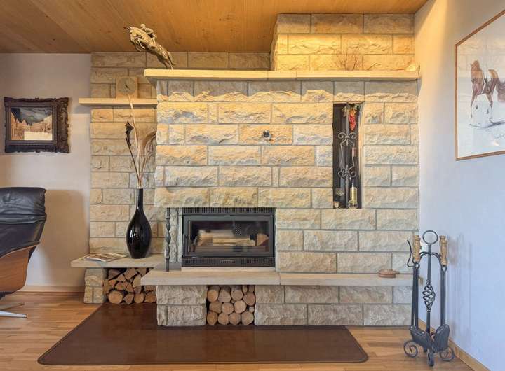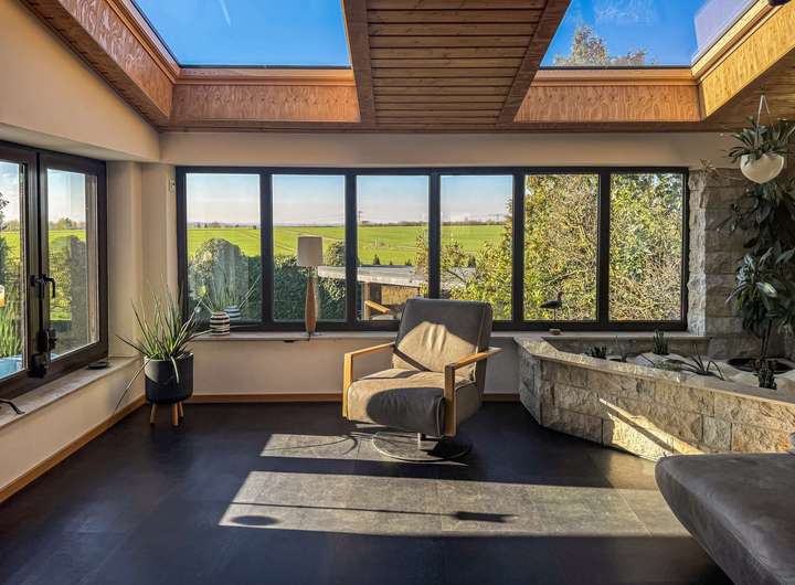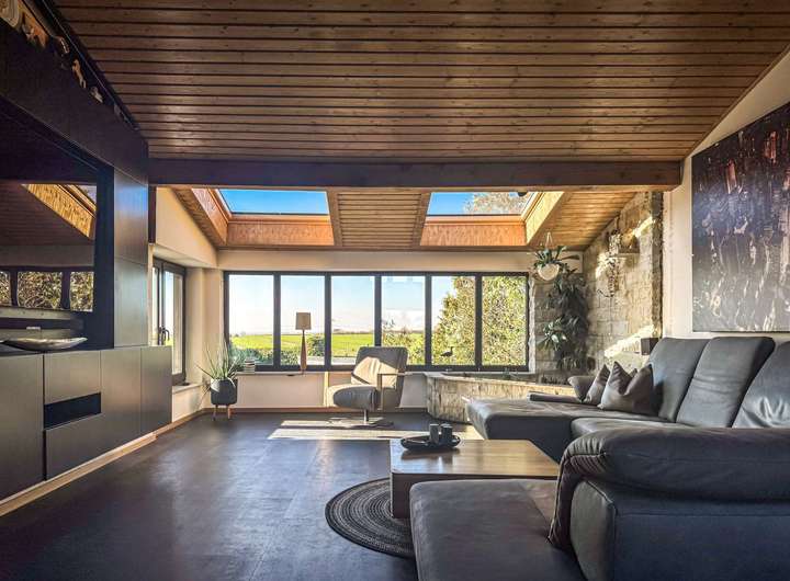 Das große Wohnzimmer beeindruckt mit riesigen Panoramafenstern, die einen traumhaften Blick in den liebevoll angelegten Garten und auf das direkt anliegende Feld bieten. Der angrenzende Essbereich ist leicht separiert und lädt zum gemütlichen Beisammensein ein. Der Kamin bringt zusätzliche Wärme in das Haus.