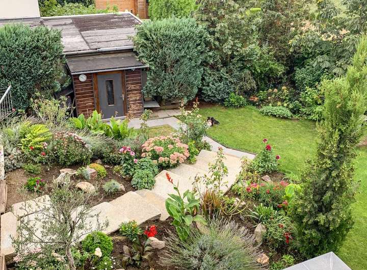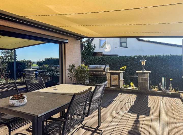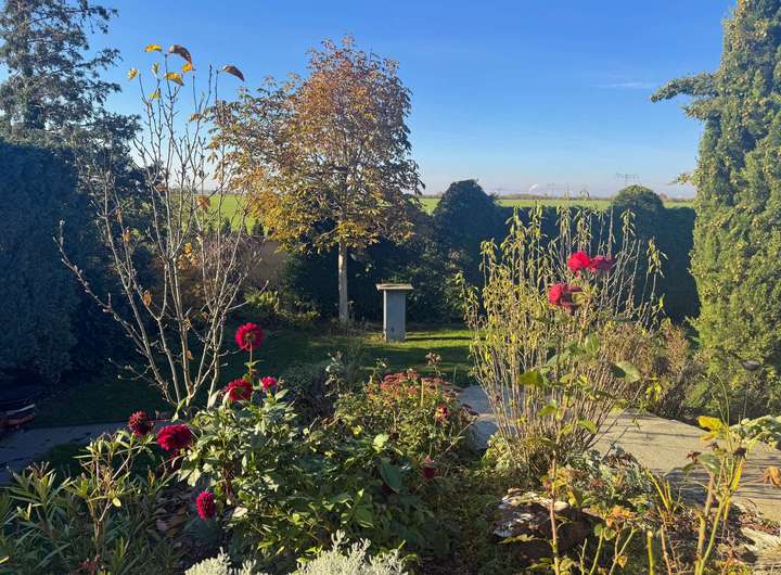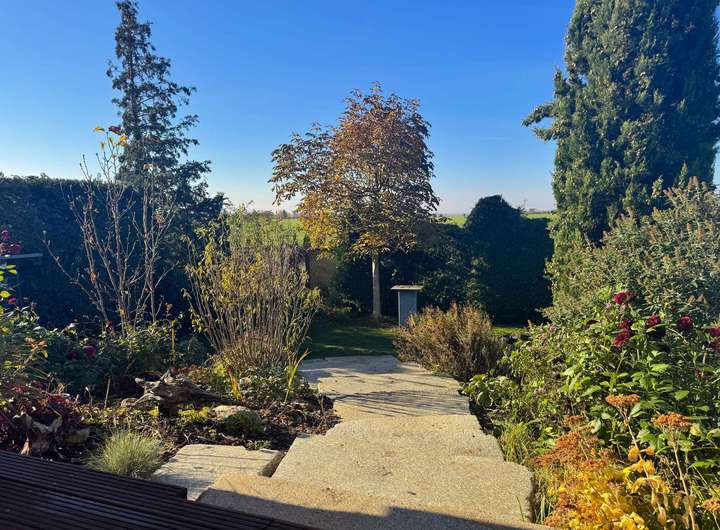 Der Garten ist ein kleines Paradies: liebevoll angelegt und mit herrlicher Terrasse mit integriertem Pool sowie unverbaubarem Blick über die angrenzenden Felder. Auch hier genießen Sie traumhafte Sonnenuntergänge und eine herrliche Weitsicht.