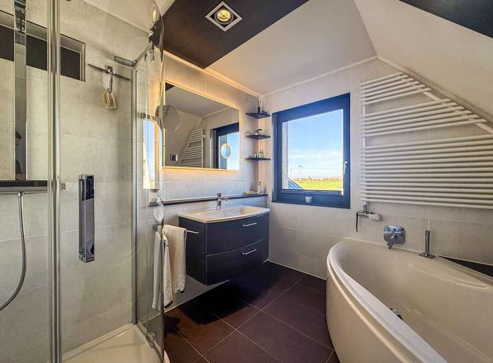 Über das schöne Treppenhaus erreicht man das Obergeschoss mit einem modernen, exklusiv ausgestatteten Badezimmer, inklusive großer Badewanne und ebenerdiger Dusche.