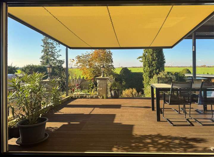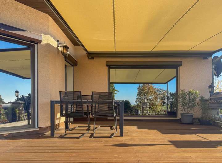 Von hier aus erreichen Sie die sehr große Terrasse, welche mit einer Markise ausgestattet ist. Der Blick, den man von hier aus hat, ist sagenhaft und vor allem die Sonnenuntergänge, die man hier erlebt, sind ein Traum.