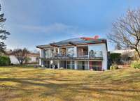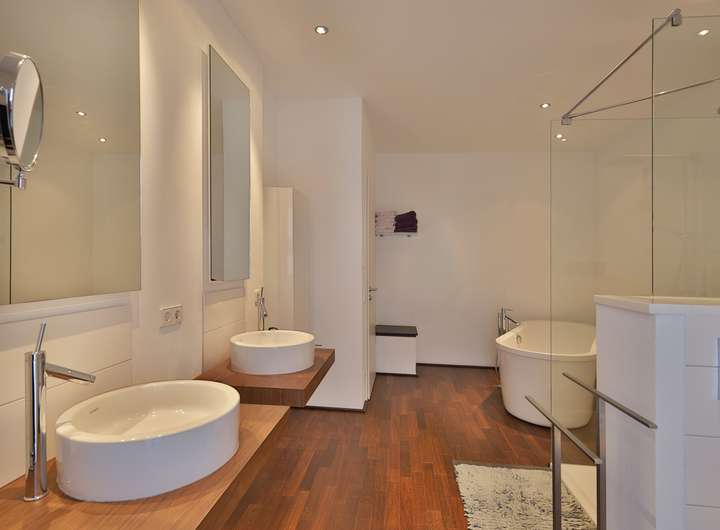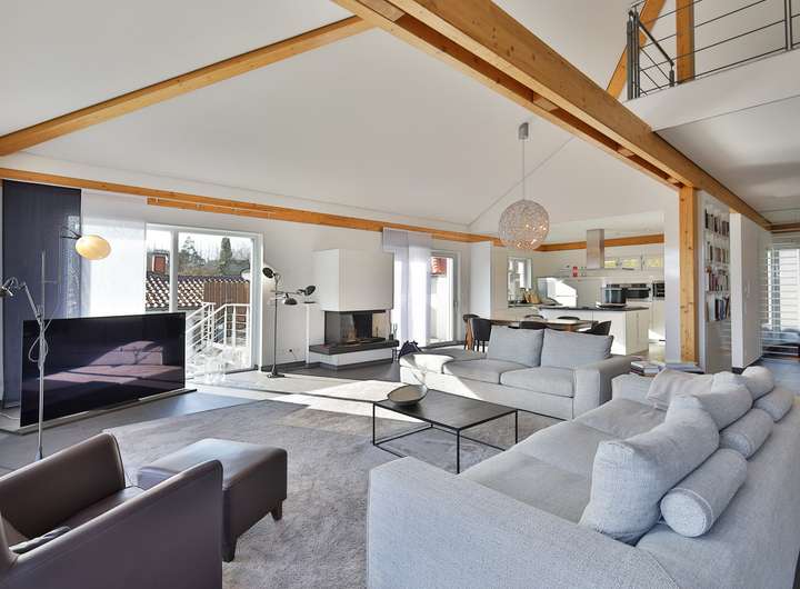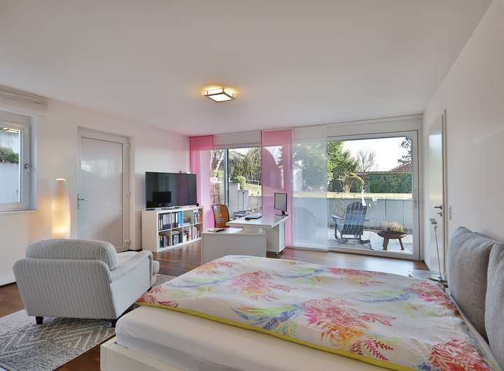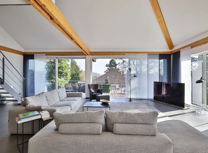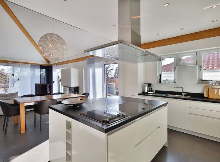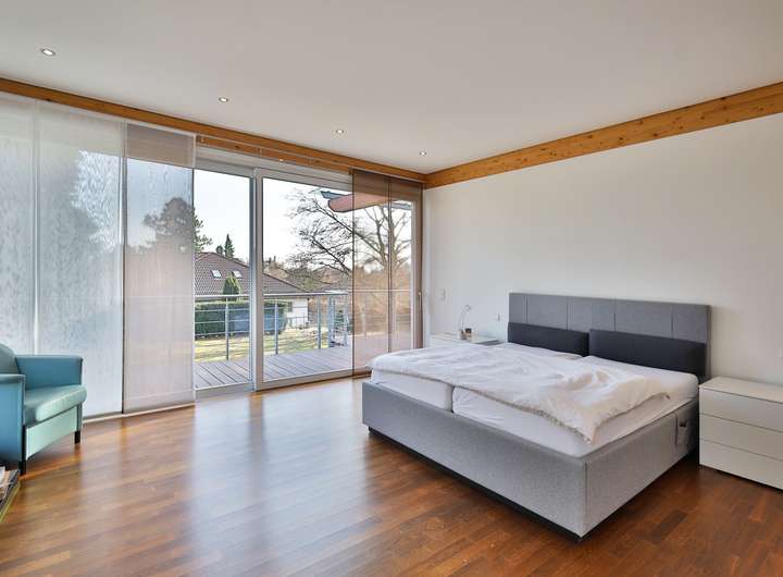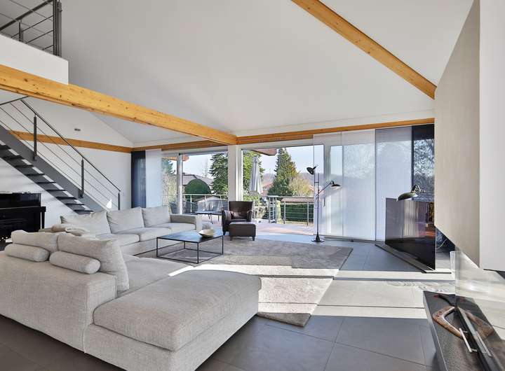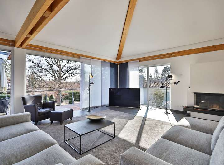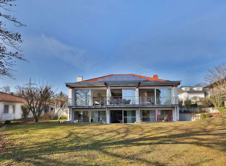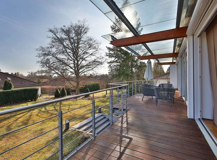 Einziehen, wohlfühlen und das Leben genießen – so könnte das Motto bei dieser Designervilla lauten. Hier folgt ein Highlight dem nächsten. Zu nennen wäre z.B. das einzigartige Raumgefühl. Raumhöhen im Wohn- und Essbereich von bis zu 6 Metern sind in der Tat beeindruckend. Das gilt auch für dessen schiere Größe von über 100 qm. Die edlen, puristischen Freitreppen in die Galerie und das Gartengeschoss sind stilvoll integriert. Geschickt wird mit den Kontrasten von Edelstahl, Parkett und den übergroßen Fliesen gespielt. Puristisch in Hochglanzweiß und offen zum Essbereich ist die sehr großzügige Küche gehalten. Ihre Ausstattung lässt keine Wünsche offen. In den warmen Monaten lassen sich die Speisen auf der direkt anschließenden Westterrasse genießen. Im Winter indes wärmt man sich an dem knisternden Feuer des Designkamins. Egal aber zu welcher Jahreszeit – der Wohnbereich ist durch die großen, bodentiefen Fensterfronten immer lichtdurchflutet. Außen lässt sich die Sonne und der Ausblick (auch in den traumhaften Garten) auf der sich über die gesamte Gebäudebreite erstreckenden Terrasse wunderbar genießen. Das geräumige Elternschlafzimmer verfügt ebenfalls über einen Terrassenzugang. Das Master-Bad ist natürlich en Suite. Der edle, dunkel gebeizte Vollholzparkett aus dem Schlafzimmer wurde auch hier verlegt. Dieser kontrastiert perfekt mit der freistehenden Badewanne von Philipp Stark. Das Haus verfügt insgesamt über 3 en Suite-Bäder sowie noch zwei weitere Duschgelegenheiten. Im Gartengeschoss befinden sich zwei großzügige Zimmer mit besagten en Suite-Bädern. Das auf der Ostseite besitzt darüber hinaus einen eigenen Eingang und kann mit dem Einbau einer Küche (Anschlüsse sind vorhanden) als Einliegerwohnung genutzt werden. Weitere Ausstattungshighlights sind sicherlich die Klafs-Sauna mit Doppeldusche und der Traum aller Hundebesitzer: eine Hundedusche mit eigenem Eingang. Technische Highlights sind u.a. das KNX-Bussystem, aber vor allem die Heizungstechnik: Energie wird aus der Geothermie sowie über die PV-Anlage gewonnen. Das Resultat: sowohl im Bedarfs- als auch im Verbrauchsausweis hat es mit Energielevel A+ Bestwerte. Überdies wird auch noch zu sensationellen Konditionen (40 Cent pro kWh) Strom in das Netz eingespeist. Last but not least: der Garten – das nächste Highlight! Über 1000m² Grundstück mit schöner Begrünung und beeindruckendem, alten Baumbestand. Aber auch hier immer im Fokus – die begeisternde Glasarchitektur der Villa. Die Straßenseite des Gebäudes mit seinen drei Garagen ist indes eher dezent im vorherrschenden modernen Landhausstil gehalten.