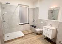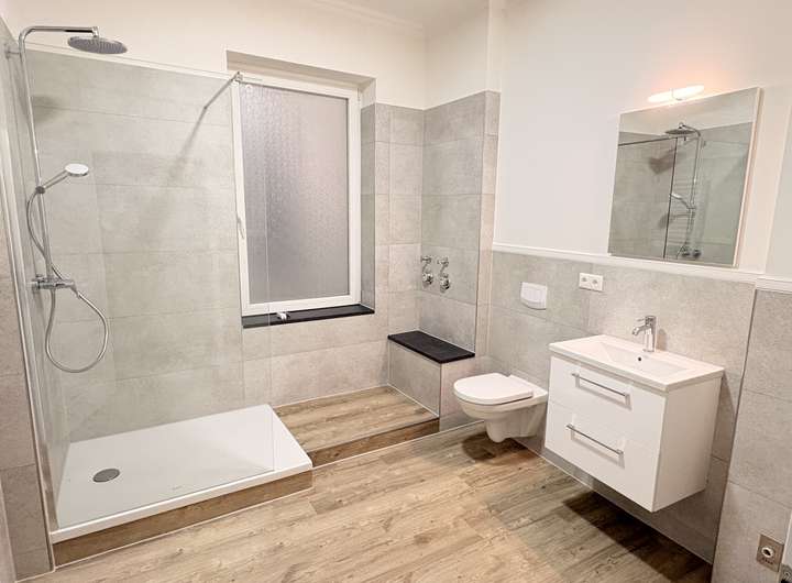 Bad: Duschkabine (neu), Toilette (neu), Waschbecken (neu), Badspiegel (neu)