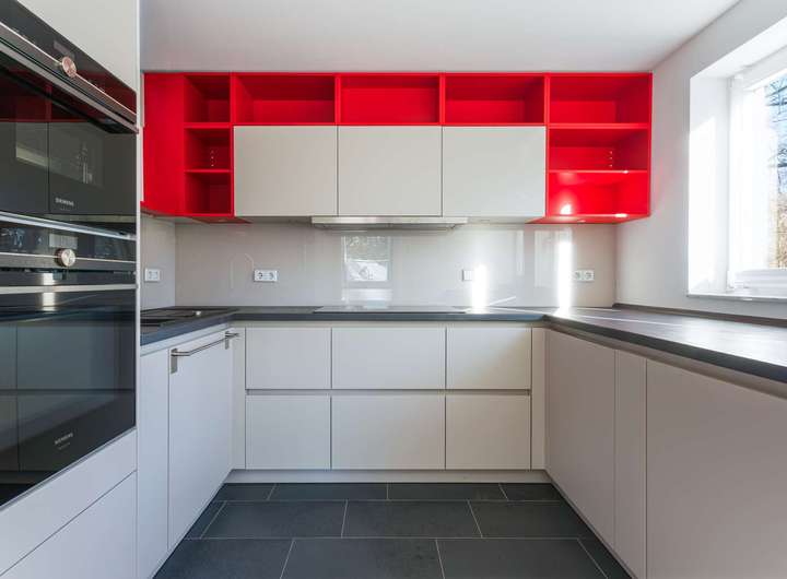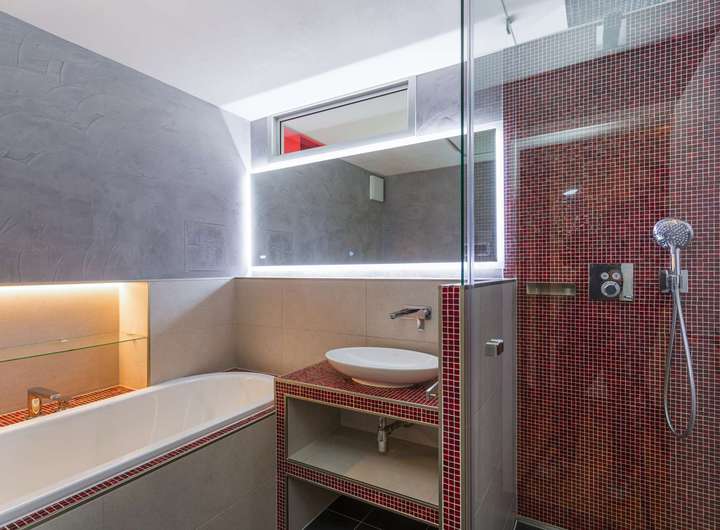 Das Schlafzimmer ist großzügig geschnitten und bietet ausreichend Platz für Schlaf und Ankleidebereich. Das exklusive Badezimmer wurde 2019 komplett modernisiert und besticht durch rote Glasmosaikakzente, Badewanne und Regendusche. Diese Wohnung vereint elegantes Design, hohen Komfort und eine besondere Wohnqualität an einem einmaligen Standort.