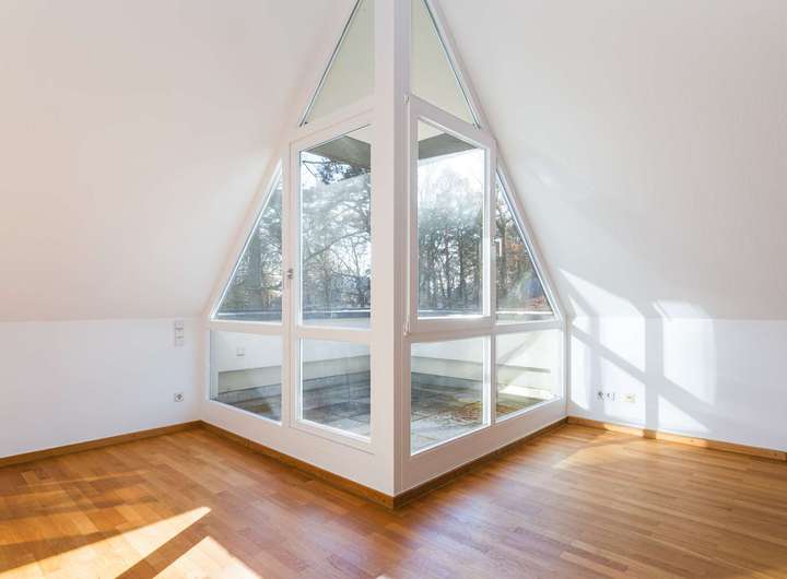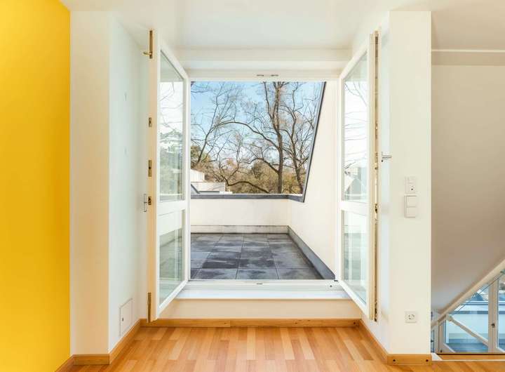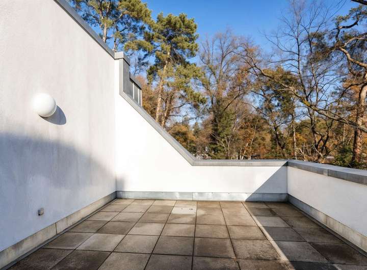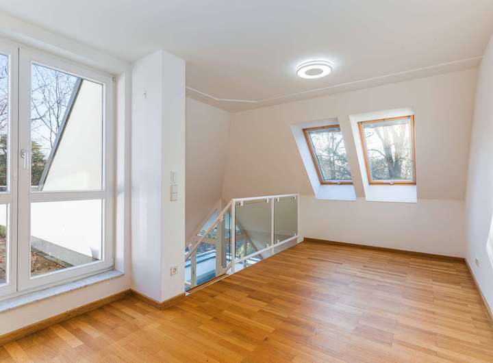 Die helle Galerie auf der oberen Ebene eröffnet vielseitige Nutzungsmöglichkeiten. Von hier aus gelangen Sie auf die große, nicht einsehbare Dachterrasse, die von altem Baumbestand umgeben ist.