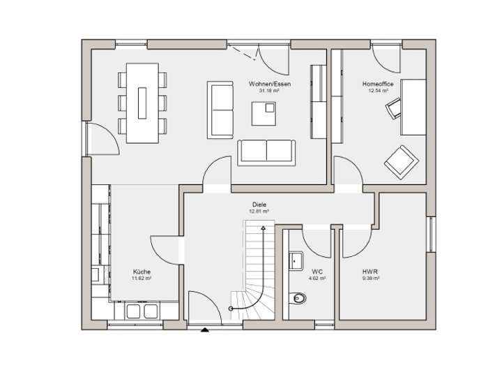 Im Erdgeschoss befindet sich die große Küche mit Blick zur Straße und das Wohn- und Esszimmer. Große Fensterelemente laden zum Gang in den Garten ein. Zudem bietet die Wohnebene ein Homeoffice, ebenfalls mit Zugang zum eigenen Garten, ein WC und einen geräumigen Hauswirtschaftsraum für die Technik.