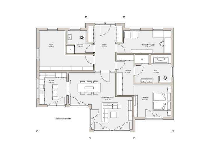 3 Zimmer, offene Küche, Diele, Bad, Dusche, Ankleide, Hauswirtschaftsraum, überdachte Terrasse