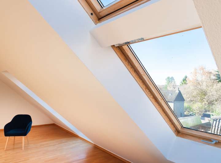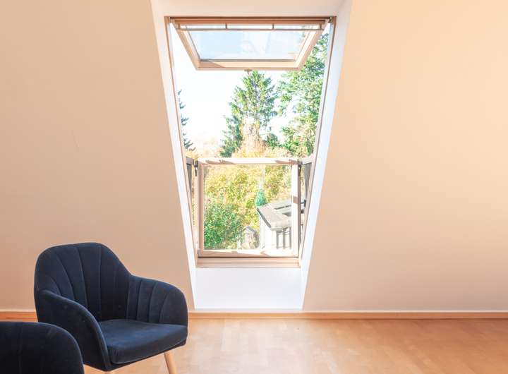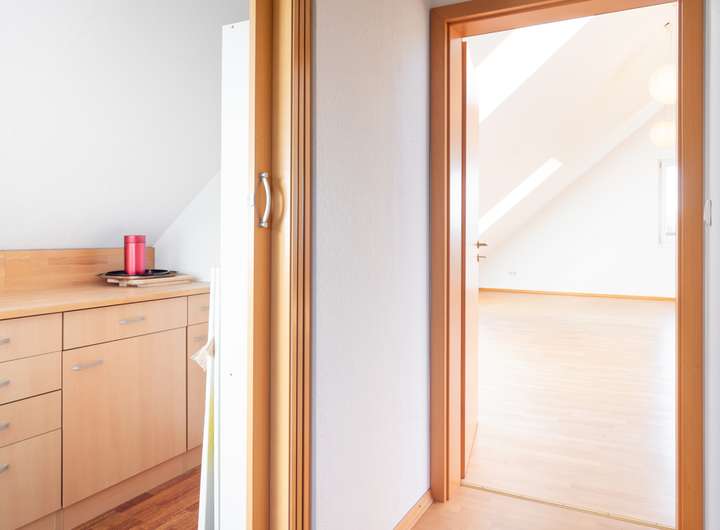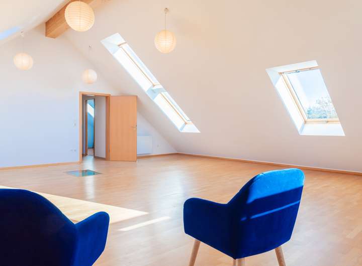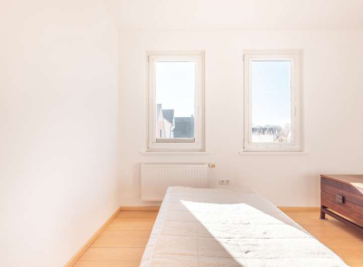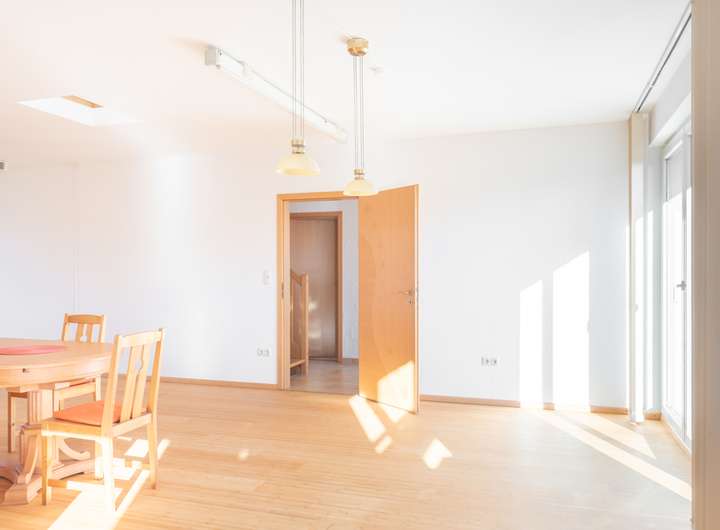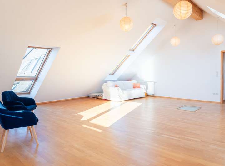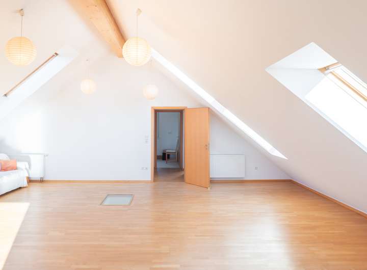 Die 7-Zimmer-Maisonettewohnung mit zwei Tageslichtbädern erstreckt sich über zwei Ebenen: dem Obergeschoss und dem Dachgeschoss.