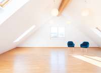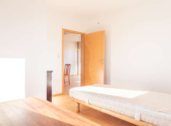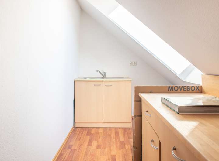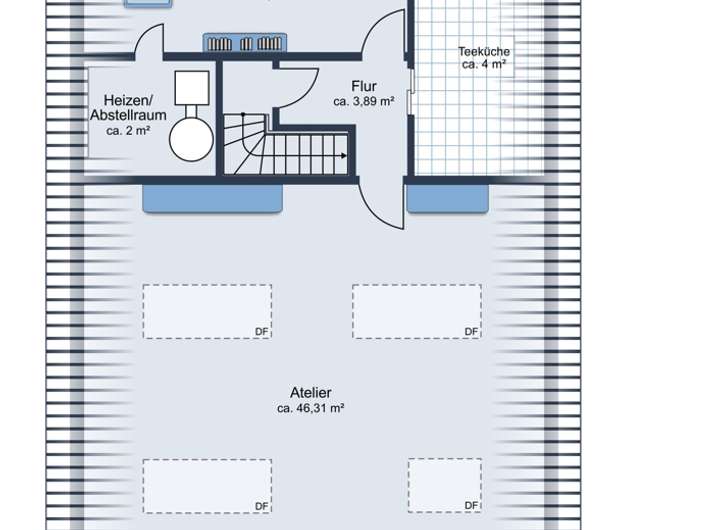 Über die interne Treppe gelangen Sie schließlich in das Dachgeschoss, das den charakteristischen Höhepunkt dieser Wohnung bildet. Auf dieser Ebene befindet sich zudem ein weiteres Zimmer mit ca. 11,55 m² sowie eine kleine Teeküche mit ca. 4,00 m², die sich bei Bedarf ebenfalls mit dem angrenzenden Raum Arbeiten/Gast/Kind verbinden lässt und den Nutzungskomfort unaufdringlich erweitert. Anschließend öffnet sich das beeindruckende Atelier, ein großer, offener Raum mit ca. 46,31 m², hervorragender Belichtung und inspirierender Atmosphäre. Die großzügige Fläche, die Raumhöhe und die Offenheit machen diesen Bereich zu einem idealen Ort für kreatives Arbeiten, konzentriertes Homeoffice oder persönliche Rückzugs- und Erholungsmomente.