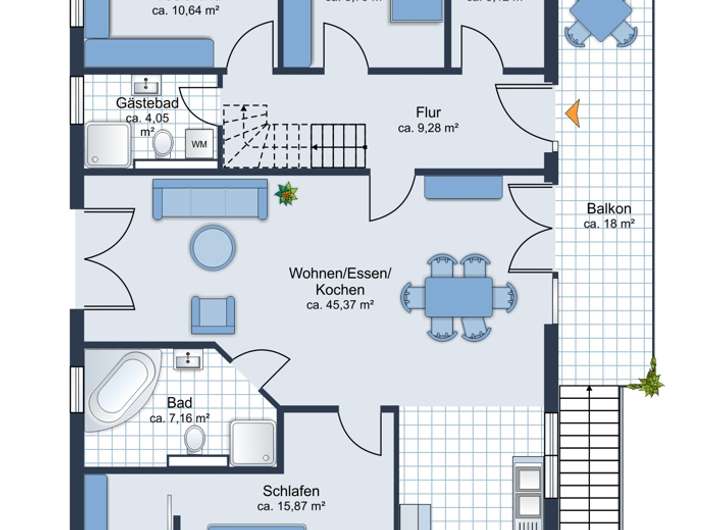 Nach dem Eintritt führt Sie der Flur mit ca. 9,28 m² direkt in den offenen Wohn-, Ess- und Kochbereich, der sich als echtes Zentrum der Wohnung präsentiert. Der gesamte Bereich umfasst ca. 45,37 m² und beeindruckt durch seine Helligkeit und den unmittelbaren Zugang zum großzügigen Balkon mit ca. 18 m². Große Fenster und die bodentiefe Balkonöffnung lassen viel Licht in den Raum strömen und schaffen eine wunderbare Transparenz. Der Übergang vom Inneren auf den Außenbereich gelingt nahezu fließend, sodass drinnen und draußen zu einer atmosphärischen Einheit verschmelzen. Dieser besondere Raumverbund macht den Alltag nicht nur angenehmer, sondern bietet zugleich eine hohe Wohnqualität in jeder Jahreszeit.