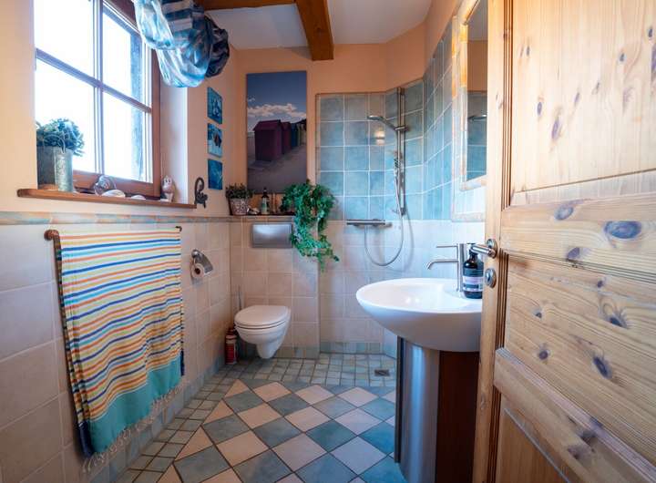 Das Gäste-Bad im Erdgeschoss ist modern gestaltet und verfügt über eine Dusche sowie ein Fenster.