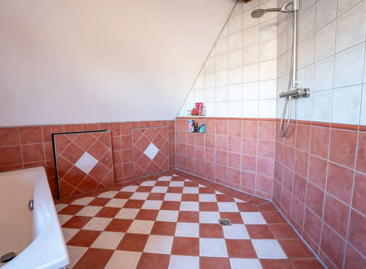 Das große Badezimmer überzeugt mit Badewanne, großzügiger Dusche und vollständig erneuerten Armaturen.