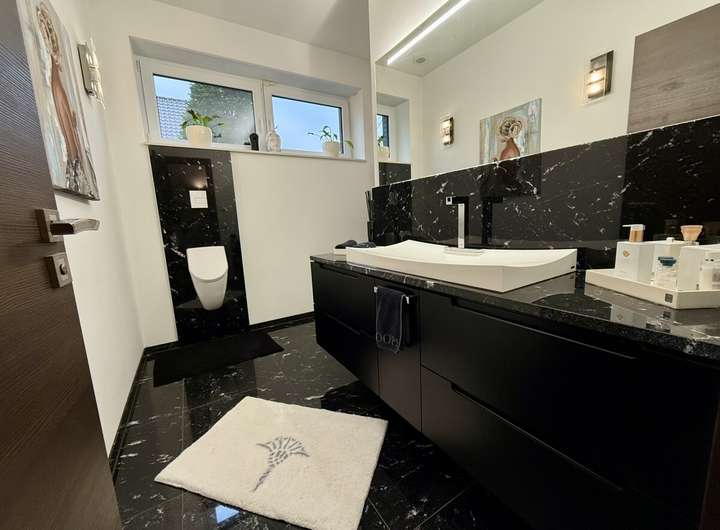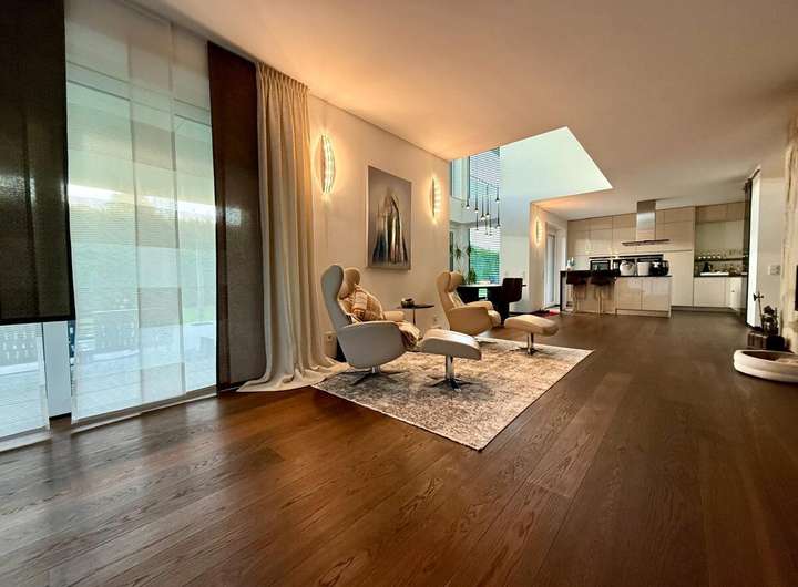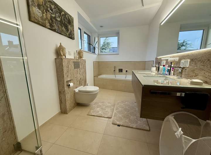 Die Immobilie ist durchweg hochwertig erstellt mit mit Echtholz- oder Natursteinböden ausgestattet. Das gesamte Haus wird durch eine Gaszentralheizung (Einbau 2023) mit Fußbodenheizung erwärmt. Zusätzlich ist eine Lüftungsanlage verbaut, welche durchweg für kontrollierte Frischluftzufuhr sorgt. Im Jahr 2025 wurde eine PV-Anlage mit 24 kWp und 14 kW-Speicher eingebaut, welche durch eine E-Ladesäule optimal ergänzt wird. Der Garten bietet viele Rückzugsmöglichkeiten und durch eine 3,5 m hohe Hecke absolute Privatsphäre. Eine Videoüberwachung sorgt zusätzlich für Sicherheit.